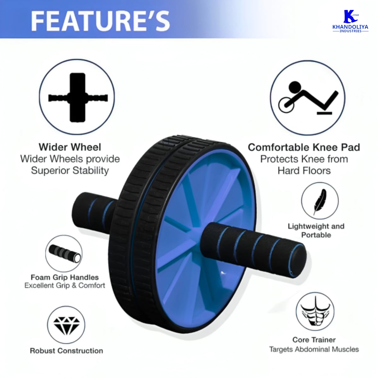The K-Star Ab Wheel Roller is engineered for effective abdominal muscle training and full-body engagement. By activating the core, obliques, shoulders, chest, arms, and lower back, it delivers a challenging workout that enhances strength, endurance, and stability. Compact and easy to use, this ab roller for abs workout is suitable for beginners and advanced fitness enthusiasts. Its smooth-rolling wheel and comfortable grip handles ensure controlled movement, helping maintain proper form while reducing strain during exercise.
