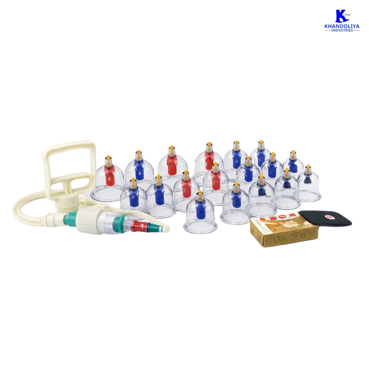 The K-Star KCGO18 Vacuum Cupping Set is a complete 18-piece therapy kit that combines vacuum cupping, guasha massage tools, and massage oil for comprehensive hijama therapy, physiotherapy, and wellness treatments.